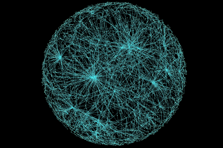 Metabolitos (puntos blancos) en la mitocondria están conectados por líneas de reacciones (lineas color cian) que las interconectan. Las reacciones son catalizadas por enzimas que se han detectado en la mitocondria por la proteómica (La proteómica es el estudio y caracterización del conjunto de proteínas expresadas de un genoma (proteoma). Centros densos aparecen como metabolitos, como el ATP, que intervienen en muchas reacciones.