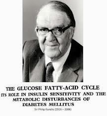 In 1963, Randle, Garland, Hales and Newsholme proposed the existence of a glucose fatty-acid cycle in which excess lipid oxidation leads to inhibition of glucose oxidation in muscle tissue. Calorimetric studies confirmed these observations in man.